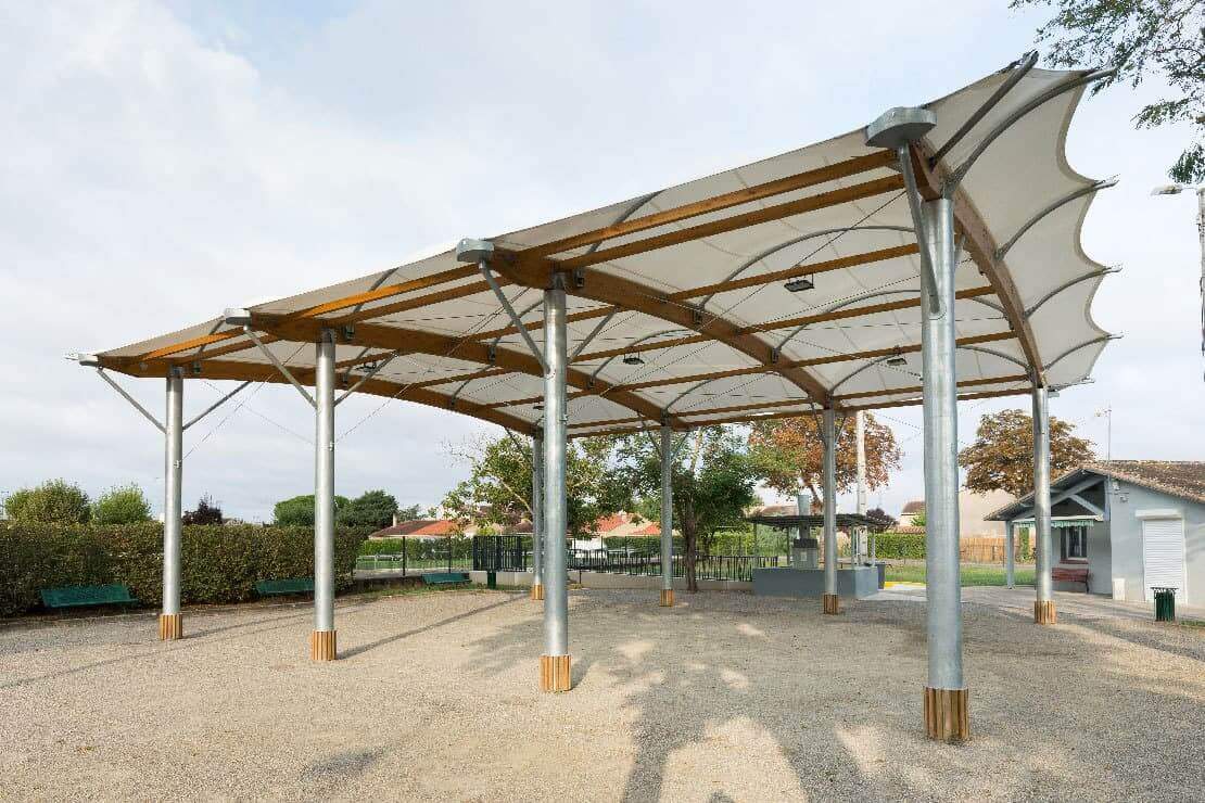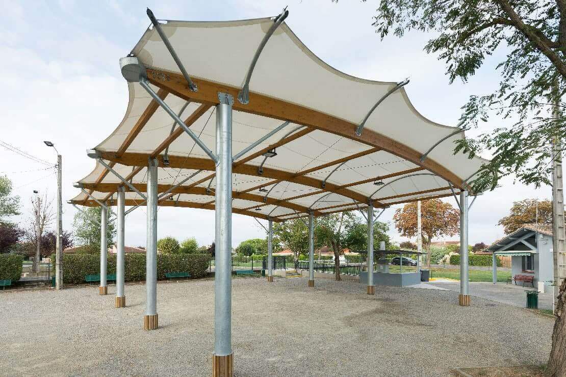 Construction d’un boulodrome couvert par une membrane textile montée sur une charpente mixte bois lamellé-collé et acier galvanisé. Protection bois pieds de poteaux.